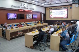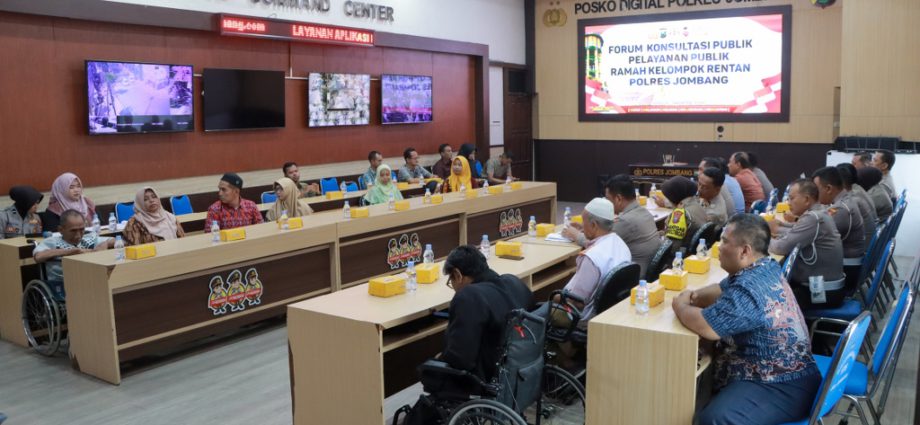 Jombang (Polres Jombang) – Kepolisian Resor Jombang bersama dengan Dinas Sosial Kab. Jombang, Dinas Pendidikan Kab. Jombang, persatuan penyandang disabilitas Indonesia (PPDI) Kab. Jombang, Ikatan Penyandang Cacat (IPC) Kab. Jombang, Persatuan Tuna Netra Indonesia (PERTUNI) Kab. Jombang, Gerakan Tuna Rungu Indonesia (GERKATIN) Kab. Jombang, Disabilitas Motorik Indonesia (DMI) Kab. Jombang dan Komunitas Volunteer Disabilitas Jombang (KVDJ) menyelenggarakan rapat Konsultasi Publik dalam rangka Polres Jombang memberikan pelayanan ramah kelompok rentan yang dilaksanakan pada hari Rabu tanggal 11 September 2024 di ruang Jombang Command Centre (JCC) Polres Jombang.